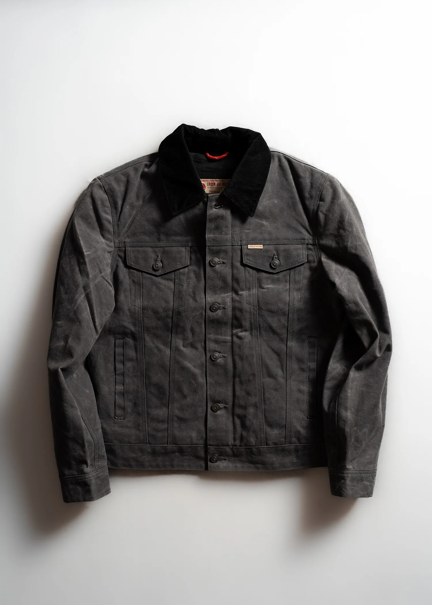 - Corduroy collar, front placket, and interior cuff detailing